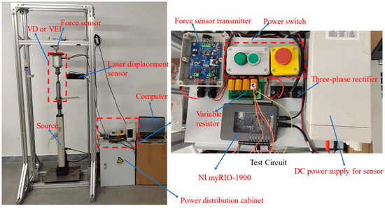 The time-domain test can effectively characterize the damping and inertance properties of the VEI–VD device, and verify the accuracy of the model. According to the time-domain test, it can be used to develop the model of VEI–VD. The time-domain test bench is shown in Figure 7, where the servo motor driven (MSMF082L1A1) electric cylinder provides the power source at the bottom of the bench, a laser displacement sensor (KathMatic 200 mm) is applied to measure the displacement of device, and a force sensor (Transcell FAK-250 kg) was installed on the upper part of the test bench. In addition, NI My-Rio 1900 is the control center of the whole test system, and its tasks include controlling the servo motor rotating following a set curve, controlling the resistance change of the EMD circuit, receiving voltage signals of the force sensor and displacement sensor and converting them into corresponding physical quantities.