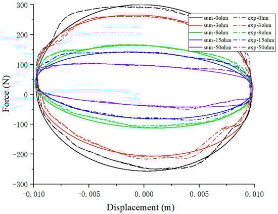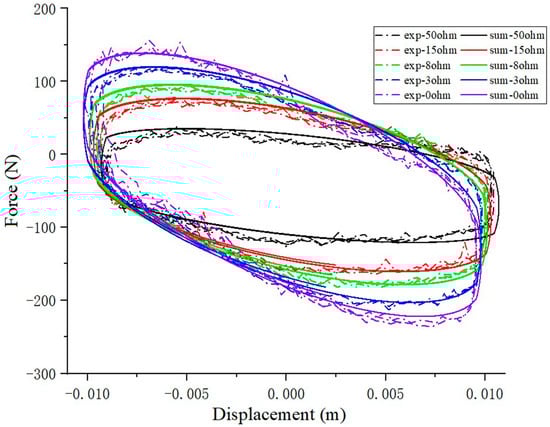 Figure 9 shows that the variable damping characteristic of the VD device under different external resistance. It is seen that the enclosed areas of the force–displacement loops increase with the increasing of external resistance, which means that the damping coefficient can be controlled by changing the branch resistor. The results of the VEI–VD characteristic curve show that the device can use the controller to select appropriate branch resistors to adjust the damping and inertance.