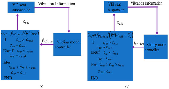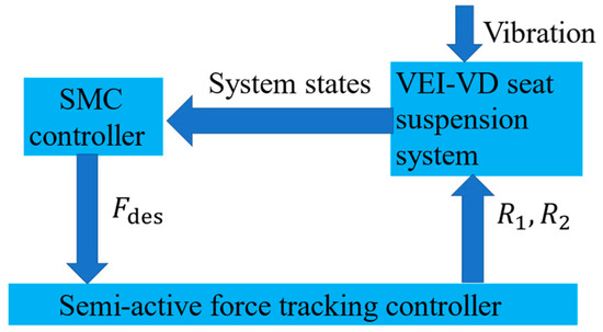 For the VEI–VD seat suspension system, the semi-active force tracking control of the control scheme is adopted. The flow chart of the control scheme is shown in Figure 10. The and are the branch resistors of the VEI and VD device, respectively.