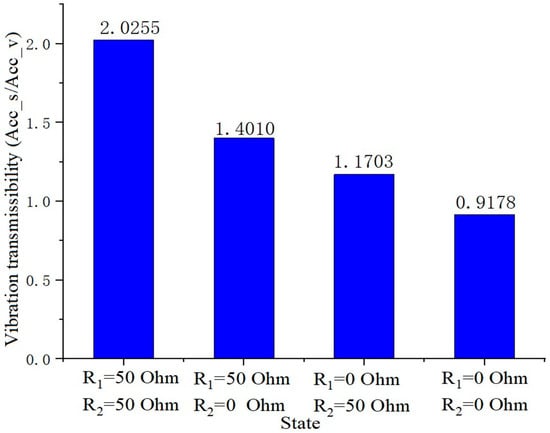 To further verify the feasibility of VEI–VD seat suspension, the relevant tests were carried out. The first thing to do is to determine the full working range of the VEI–VD seat suspension. In the test, the suspension is divided into four states, including (1).the external resistance of the VEI–VD device is connected to 50 , (2).the VD device is connected to 0 , and the VEI is connected to 50 , (3).the VEI device is connected to 0 and the VD is connected to 50 , (4).the VEI–VD device is connected to 0 . A sine source is applied, , , the acceleration vibration transmissibility of the four states near the resonance point of the system is tested. The results, Figure 13, tests show that with the change of the system state, the acceleration transmissibility of the suspension is changing, and it implies that the VEI–VD suspension adopting the method of changing the external resistance is feasible in terms of controllability.