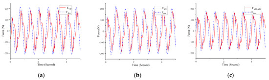The performance of force tracking strategies: (a) The force tracking of the VD device; (b) The force tracking of the VEI device; (c) The force tracking of the VEI–VD device.