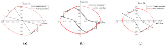 The simulation experiment of VEI and VD device was carried out, Figure 15 shows that the VD device can only achieve a limited region in the second and fourth quadrants of the available force-velocity diagram, while the VEI device can achieve mechanical control within the four quadrants of the available force-velocity diagram. However, the VEI–VD device loses a part of positive power compared with VEI device because the VD device plays a part. More essentially, from the energy point of view, both VEI device and VEI–VD device can store energy.
