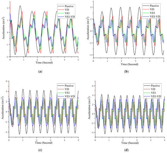 Acceleration under different sinusoidal excitation: (a) ; (b). ; (c). ; (d). .