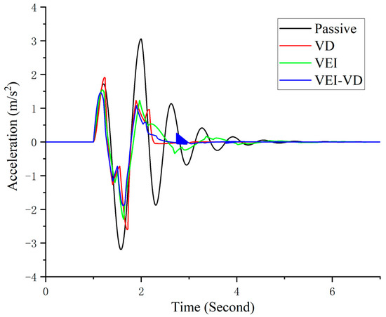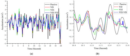 The Figure 23 shows that acceleration under bump excitation. The peak-to-peak acceleration difference of the VD, VEI and VEI–VD seat is reduced by about 21.33%, 25.43%, and 29.26%, respectively. Furthermore, the VEI–VD seat’s acceleration using the semi-active control strategy at the second and third vibration peaks is better than that of the VD and VEI seat, indicating that the designed VEI–VD device has a better vibration control effect on the seat.