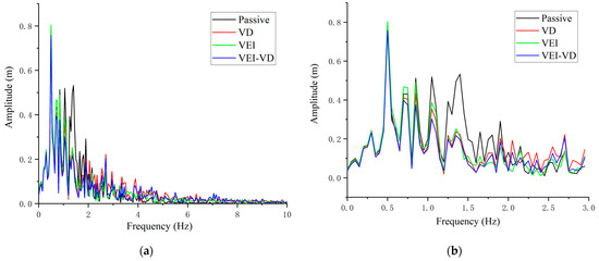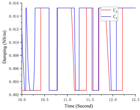 In order to analyze the frequency characteristics of the VEI–VD device, we apply a set of parameters to , where , , and are the minimum and maximum damping of the variable dampers, respectively. and are assumed to be controllable within to , the VEI and VD devices use electromagnetic variable dampers of the same design, and the damping value can be changed from minimum to maximum.