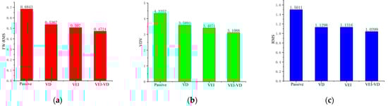Based on ISO 2631-1, the frequency weighted-root mean square (FW-RMS) acceleration and the fourth power vibration dose value (VDV) are obtained to evaluate the seat suspensions’ performance. In Figure 19, the reduction of the FW-RMS indicates the improvement of ride comfort, and the VDV values show that the VEI–VD seat suspension has a superior performance in the shock vibration. Table 3 shows the performance improvement of the three semi-active suspensions compared with the passive suspension. From the effect of the random excitation test, the performance effect of VEI–VD seat suspension is better than that of VD and VEI seat suspension, which verifies the views in 5.2 Sinusoidal excitation test.