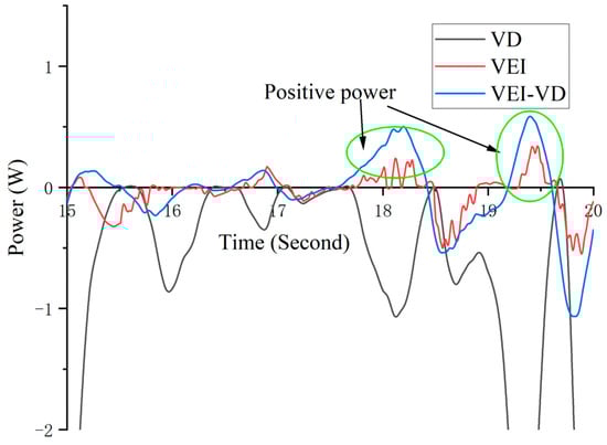 Figure 22 shows the power of semi-active seat suspension, the power is the product of the output force and output velocity of the suspension, it implies the VEI and VEI–VD devices provided power to the outside. In VEI and VEI–VD seat suspensions, when the power of them is less than zero, it means that a part of the mechanical energy of seat vibration is stored in the flywheel. When the power is greater than zero, it means that the stored energy in the flywheel is converted into mechanical energy and suppresses the vibration of the suspension.