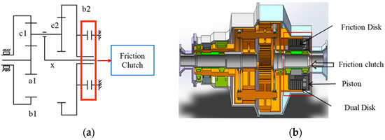 As shown in Figure 1b, the friction clutch consists of friction discs, dual discs, piston, input shaft and output shaft. When the friction begins to engage, pressure will be applied to the piston, which is then transferred to the friction disks and dual disks. Due to the engagement pressure, friction discs and dual discs begin to move closer to each other. When they come into contact, torque is transmitted through friction.
