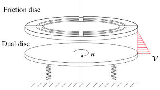 In Figure 2, the pair is driven at a speed n and the friction disc is stationary. The wet clutch friction pair is regarded as two relative moving discs with a distance of δ, since the δ is generally small enough, the fluid between them can be assumed as a stratospheric flow [16], and the speed of the fluid between the two discs can be considered as a linear change. The lubricant between the two forms shear stresses due to the relative motion of the dual and friction disc. Where, n is the rotation speed of drive disc. v is the speed difference between drive disc and driven disc.