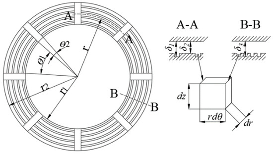 where rb1 and rb2 are the inner and outer diameters of each annular groove in the area of θ2. Then, the drag torque in the annular groove area of θ2 can be obtained as:
