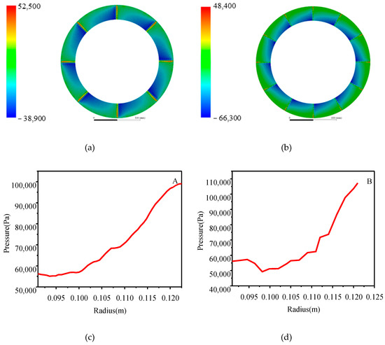Pressure distribution: it can be seen in Figure 8 that the oil film is divided into several fan-shaped areas by radial groove, and the pressure is distributed symmetrically. The high-pressure area is mainly distributed in the outer ring; when the friction disc rotates in the anti-clockwise direction, the oil pressure in the sector area decreases in the anti-clockwise direction due to the strong oil scraping ability of the radial oil groove.
