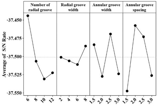 The signal-to-noise ratio response of oil groove structure parameters to drag torque is shown in Table 5. MINITAB allocates rank based on DELTA value, and rank 1 is the most influential. That is, the descending order of the influence of the structural parameters of the oil groove on the drag torque is as follows: the number of radial grooves, the width of the annular groove, the spacing between the annular grooves, and the width of the radial groove. The main effect of the signal-to-noise ratio of the drag torque is shown in Figure 10. It shows that the optimal combination is when the number of radial grooves is 10, the width of radial groove is 6 mm, the width of annular groove is 2.5 mm, and the spacing of annular groove is 2 mm.