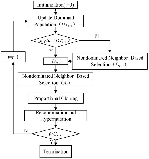 Non-dominated neighborhood immune algorithm (NNIA) is an immune algorithm that simulates natural immune function and is used for multi-objective optimization [18]. Inspired by immunology, the algorithm simulates the coexistence of diverse antibodies and the activation of a small number of antibodies in the process of immunization, and takes a small number of relatively independent non-dominant individuals as active antibodies. The proportion of active antibodies was cloned, recombined, and hypermutated based on the selection of non-dominated fields and the measurement of crowding degree [20]. NNIA is a multi-objective optimization algorithm based on Pareto optimal solution. Its focus on low congestion area has great advantages in high-dimensional multi-objective optimization problems. Figure 12 represents the flow chart, and the main steps are as follows [18,19,20]: