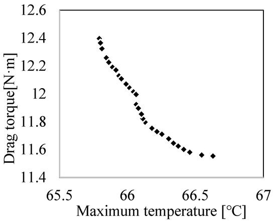Table 8 lists the parameters in NNIA algorithm. Table 9 describes the partial solution set of NNIA and Figure 13 shows the Pareto optimal solution of drag torque and maximum temperature. Table 10 describes that when only a single optimization objective is considered, the minimum drag torque can reach 11.56 Nm, and the minimum temperature can reach 72.57 °C. It means drag torque and the maximum temperature cannot be minimized at the same time. However, the solution set can be used to design the structural parameters of radial-annular compound oil groove according to different performance requirements.