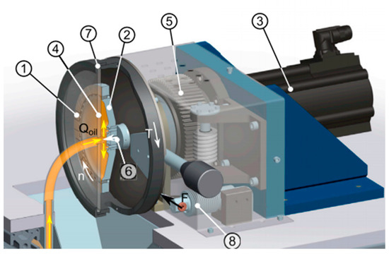 Test rig for drag torque [16]. ➀ clutch disc, ➁ disc bracket, ➂ driving motor, ➃ glass plate, ➄ precision thread, ➅ valve, ➆ housing, ➇ force sensor.