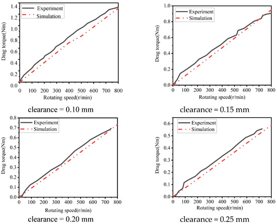 In these experiments and simulations, the clearance between friction discs and dual discs were set to 0.10 mm, 0.15 mm, 0.20 mm, and 0.25 mm, respectively. The experimental results [16,23] and simulation results of drag torque are shown in Figure 16.