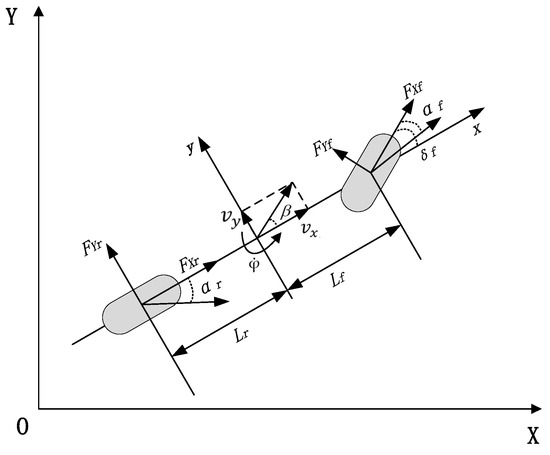 Considering the trade-off between computational efficiency and modeling accuracy of the MPC controller, the bicycle model shown in Figure 2 [18] is adopted as the ego-vehicle dynamics model, and the corresponding model parameters are shown in Table 1.