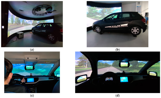 The motion-base driving simulators. (a,b) Outside, (c,d) Inside.