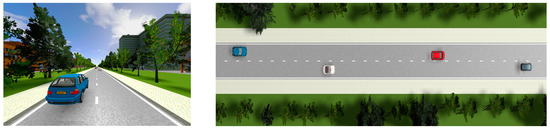 The training data of the GPR model is collected using a motion-base driving simulator consisting of a real vehicle cockpit and a 180° ring screen as shown in Figure 4. A standard two-lane road is constructed as shown in Figure 5, with obstacles in the left and right lanes at intervals with a longitudinal distance (120–150) m. Drivers with extensive driving experience are recruited to drive the vehicle to complete the obstacle avoidance experiments. Drivers are instructed to perform obstacle avoidance operations at diverse safe distances based on their driving experiences. To consider the impact of driving speed on the process of obstacle avoidance without increasing the operational difficulty, we set up three groups of experiments; the speed intervals of each group are (0–30 km/h), (30–50 km/h) and (50–70 km/h), respectively. In each group of obstacle avoidance experiments, drivers can accelerate and decelerate appropriately within the speed interval according to their driving habits.