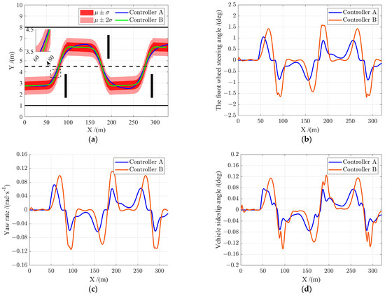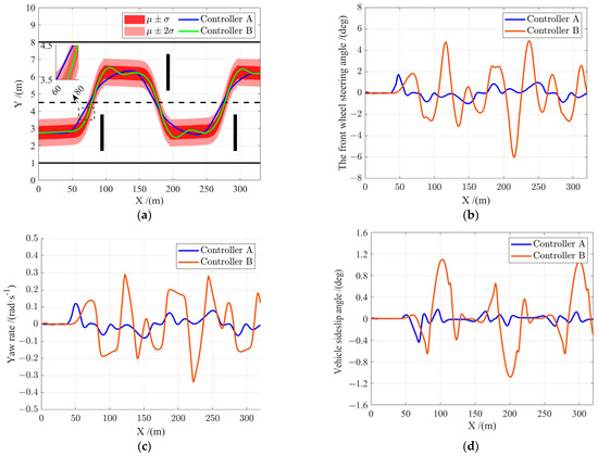 Figure 7 illustrates the experimental results of obstacle avoidance on the high-adhesion road. As shown in Figure 7a, both controller A and controller B achieve safe obstacle avoidance. Since no specific reference trajectory is given, controller A would start the obstacle avoidance operation in advance when facing each obstacle and choose the smoothest obstacle avoidance route possible within the soft constraints to ensure high level of safety, as well as optimal stability and control smoothness. As shown in Figure 7b, the front wheel steering angles of controller A and controller B both stay within a reasonable range throughout the obstacle avoidance process and the front wheel steering angle of controller B is significantly greater than that of controller A, with a maximum steering angle of 1.55 deg compared to 1.1 deg for controller A. It is also shown in Figure 7c,d that, throughout the obstacle avoidance process, the control increment of controller A is smoother and the slip angle and yaw rate of controller A are both smaller than those of controller B, demonstrating better vehicle stability.