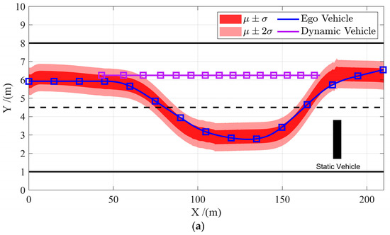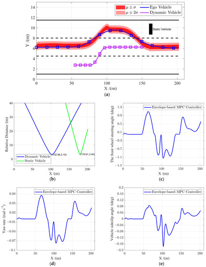 Figure 10 shows the experimental results of scenario C. As shown in Figure 10a,b, based on the constructed obstacle vehicle model, the ego-vehicle enables active and safe obstacle avoidance when the obstacle vehicle merges in, and the minimum distances between the ego-vehicle and the dynamic and static obstacle are 3.19 m and 3.45 m, respectively, both reasonable safe distances. Although there are some abrupt changes in the generated GPR envelope due to sudden changes in the motions of the dynamic vehicle, the proposed controller ensures smooth obstacle avoidance by crossing the soft constraint and avoids collision by staying within the hard constraint . As shown in Figure 10d,e, during the entire process, the maximum yaw rate and the sideslip angle were no more than 0.08 rad/s and 0.18 deg, respectively, indicating that the vehicle is maintained at a stable state. The experimental results prove that the obstacle avoidance controller is robust to environmental uncertainties in the sense that the GPR model is capable of generating safety envelopes in response to abrupt changes in the motion states of surrounding obstacles. Furthermore the proposed constrained multi-objective MPC controller is able to perform safe and stable obstacle avoidance based on the dynamically generated envelopes.