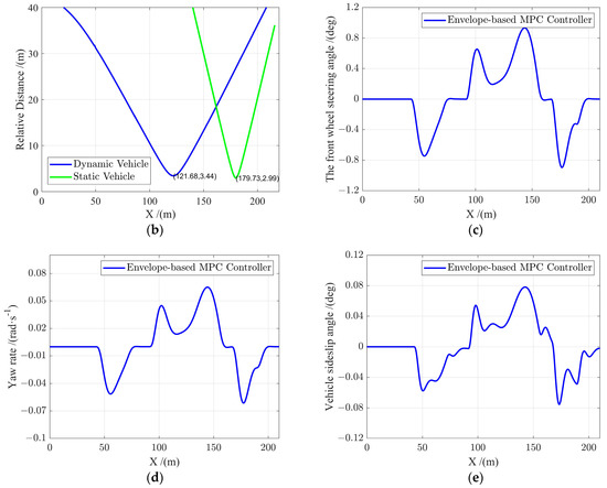 Obstacle avoidance experiment results of scenario B. (a) GPR−based obstacle avoidance envelope and the obstacle avoidance trajectory. (b) Relative distance. (c) The front wheel steering angle. (d) Yaw rate (e) Vehicle sideslip angle.