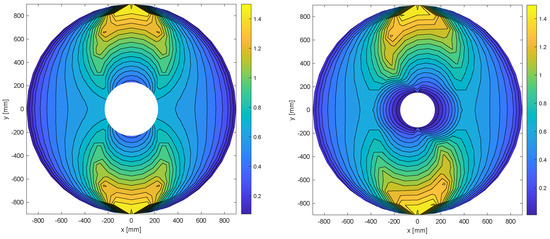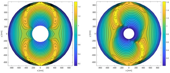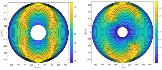 Most robot applications consist of picking and placing objects, moving first among the z axis to pick the part, then horizontally among a certain plane, and then again along the z axis to place the part. For this reason, the direction of interest was first set along the x axis. For each set of coordinates , the orientation was set to expressed as Euler angles (z, , rotation sequence), and the inverse kinematic problem was solved. With the set of joint values obtained, the Jacobian matrix was calculated. By inverting the Jacobian matrix, it was then possible to compute the joint velocities, consider their absolute value, and divide it by their relative maximum joint velocity. For a given point, the maximum value of the division was taken as , and then K is the KDI value for that specific point. As mentioned above, the value of the KDI index depends on : the maximum joint speed was first set as for each joint. Figure 4 shows the trend of the KDI value obtained in the workspace for both architectures. The whole horizontal plane of the workspace is depicted in a color that represents the value of the obtained KDI from blue (lowest values) to yellow (highest values). The region of the workspace depicted in blue denotes an area of the workspace where the KDI assumes a low value and therefore an area of the workspace where the robot cannot reach a high speed when performing a movement along the x axis. In contrast, the region of the workspace depicted in yellow denotes an area where the KDI assumes a high value and the robot can reach a high speed when moving along the direction of the x axis. Figure 4 shows no considerable difference between the two architectures, except that the graph for the articulated robot with a non-spherical wrist is not symmetrical and the KDI assumes low values not only near the outer limit of the workspace but also near its inner limit.