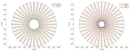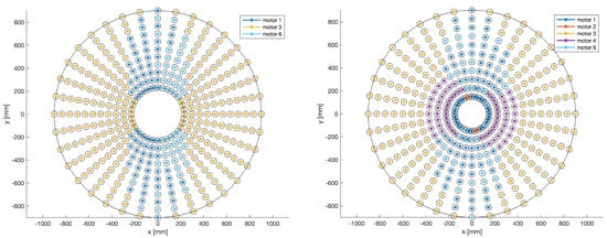 It is particularly interesting to analyze, for the different points in the workspace, which is the motor p, i.e., the motor that is closest to its maximum velocity and therefore the bottleneck. Understanding which motor is the p motor will greatly contribute to the optimal choice of the maximum values of each joint speed to maximize the area of the workspace in which a high value of linear velocity can be obtained along a certain direction. Figure 5 shows, for each point considered for both architectures, the motor p nearest to its maximum velocity: each point is depicted in a color that represents the motor working closest to its maximum speed.