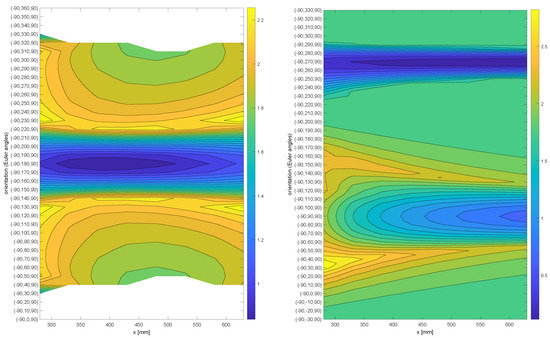 The same analysis was also performed in terms of angular velocity : the same set of points considered for the angular velocity was used, but in this case, the orientation was varied from to with an angular set of in terms of . For each point and each orientation, the KDI was calculated for both architectures, and the results obtained are shown in Figure 13.