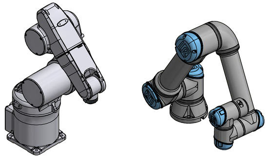 Articulated robots with non-spherical wrists and that do not satisfy the Pieper criterion are also commonly used for particular industrial tasks, such as spray painting, where the wrist of the robot needs to be hollow [2,3]. For these robots, a numerical method needs to be used in order to solve the inverse kinematics, and therefore, the stability of the numerical solution and its convergence rate cannot be guaranteed. More recently, a new architecture found mainly in collaborative robots such as the Universal Robots UR-5 arm or TM5-700 has been proposed. This architecture is composed of six links connected by revolute joints, but the last three joints do not intersect at a common point; however, three consecutive joint axes (the second, third, and fourth) are parallels, and thus, the Pieper criterion is satisfied. The inverse kinematics of this structure, in particular for the Universal Robots UR-5/UR-10 arms, has been widely studied [4,5,6,7] as well as its singularities [8,9,10].