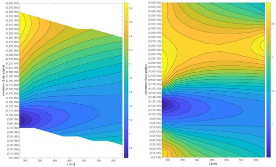 As mentioned above, it is also interesting to compare the two robot architectures in terms of angular velocity , , and . Clearly, for the orientation , expressed as Euler angles, the angular velocity of both manipulators is strongly correlated with the maximum velocity of the sixth joint. Instead, in the first place, it is more significant to calculate the KDI for the angular velocity . The analysis of the KDI in terms of angular velocity was carried out as follows: first, a specific set of points was chosen. The analysis was carried out in the highest reach plane, y was set as and x was set to vary from to with a step of . For each point, to evaluate the rotational velocity , the orientation was varied from to expressed as Euler angles, with an angular step of in terms of . For each point and each orientation, the KDI was calculated for both architectures, and the results obtained are shown in Figure 11.