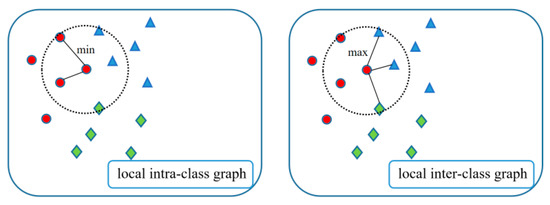 The local information reflects the neighborhood structure relationship between samples, and extracting effective neighborhood discriminant features is important to improve the accuracy of fault classification. For better classification, ESBDP expects samples belonging to the same class in the neighborhood to be more aggregated and samples in different classes to be separated from each other. Therefore, we combine the label information to construct local intra-class graph and local inter-class graph . An example of graph construction is given in Figure 1.