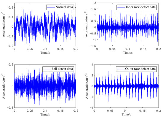 In this experiment, the bearing data were used from the Case Western Reserve University (CWRU) rolling bearing dataset. As shown in Figure 4, the data acquisition platform is divided into three main parts, from left to right, the motor, the torque sensor, and the dynamometer. The drive-end bearing vibration data at 12 kHz sampling frequency and 1772 rpm were used in our diagnosis experiment, containing four different types of data, namely normal data, inner race defect data, outer race defect data and ball defect data. Figure 5 shows the one-dimensional signals of the four states. With a sampling length of 1024, 100 samples were obtained for each type of signal data. Then, the high-dimensional feature set is obtained by extracting the time–domain, frequency–domain and time–frequency features of the original fault samples according to the process described in Section 4. The training set is composed of 40 samples randomly selected from each class, and the rest are used as test samples. To avoid the chance of experimental results, the random experiment was repeated ten times by us. Finally, the fault recognition accuracy was taken as the average of the ten-time results.