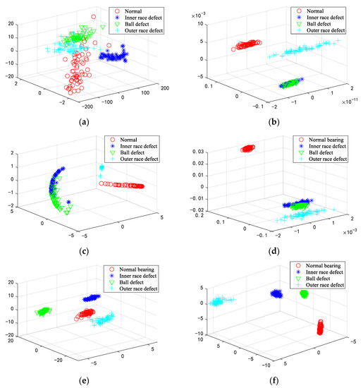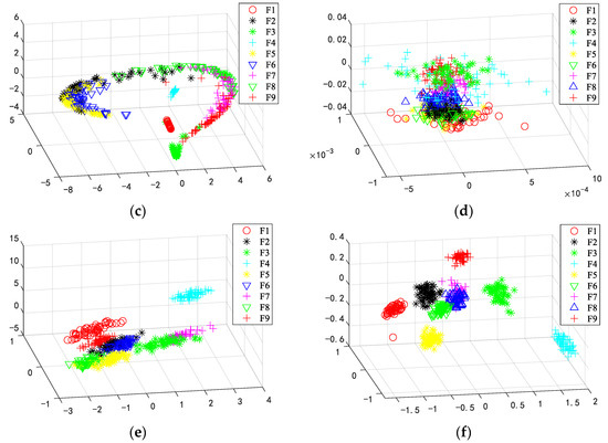 Three-dimensional distribution of test gear samples: (a) LLE; (b) LPP; (c) KPCA; (d) OLGPP; (e) LSPD; (f) ESBDP.