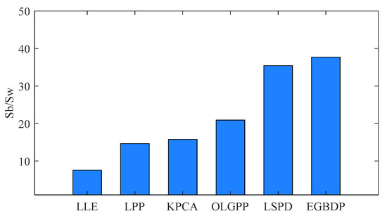 Currently, data mining and machine learning have been proven to be effective methods for data analysis and processing [6,7,8,9,10]. In the field of fault diagnosis based on data mining and machine learning, the process of processing and identifying high-dimensional fault feature datasets usually includes the following three aspects: acquisition and processing of fault data, extraction of fault features, and identification and classification of fault features. Among them, extracting effective fault features is the crucial of diagnosis. As an effective method, dimensional reduction [11,12] aims to extract low-dimensional discriminative features that reflect intrinsic information from high-dimensional data to achieve better fault diagnosis performance. According to the retained data structure, dimensional reduction algorithms are classified into two main types, i.e., algorithms based on local structure and algorithms based on global structure. The most widely used global algorithms include principal components analysis (PCA) [13] and kernel principal components analysis (KPCA) [14], etc., which are concerned with obtaining global structural information of machinery fault data for diagnosis. Among them, PCA obtains the projection direction via maximizing the covariance among samples. However, PCA is a linear diagnosis algorithm, which is difficult to employ for handling complex nonlinear fault data. For this reason, KPCA introduces kernel tricks [15] based on PCA, which can further obtain the nonlinear structural information of fault data. However, the global algorithm ignores the information of the sub-manifold structure, which has been shown to better reflect the underlying structure of the data.