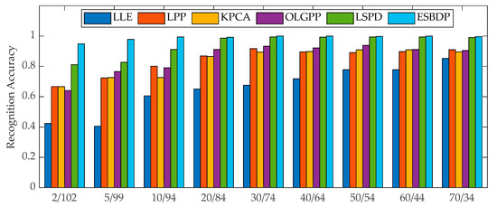 To further verify the ability of ESBDP to capture fault features, the number of samples used for training and the number of samples used for prediction were set to 2/102, 5/99, 10/94, 20/84, 30/74, 40/64, 50/54, 60/44, and 70/34 in the gear diagnosis experiments, respectively, to observe the variation of the accuracy rate of each algorithm. The results are provided in Figure 16. For different numbers of training samples, the fault diagnosis accuracy of ESBDP is consistently higher than that of the other five algorithms. Notably, the recognition accuracy of ESBDP reaches 99.53% at 10 training samples per class, which indicates that the algorithm has a great ability to capture the discriminative features hidden in the fault data.