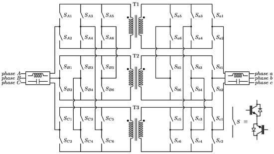 - Nasir, U.; Costabeber, A.; Wheeler, P.; Rivera, M.; Clare, J. A Three-Phase Modular Isolated Matrix Converter. IEEE Trans. Power Electron. 2019, 34, 11760–11773. [Google Scholar] [CrossRef]