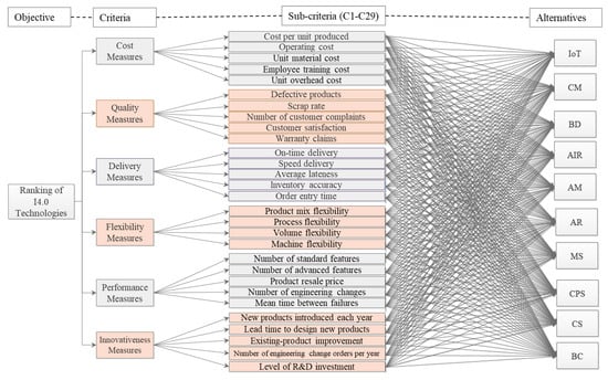 Figure 3) is proposed to rank the I4.0 technologies to achieve market competitiveness. To apply the hybrid MCDM method in order to prioritize the MSOs, all MSOs and their basic measures are initially organized into hierarchical levels (criteria and sub-criteria).