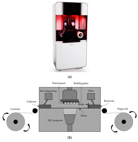 (a) Admaflex 130; (b) schematic of the Admaflex 130 DLP process.