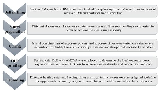 In conclusion, complex interactions between process settings, printer resolution, and composition of the photopolymerizable slurry determine the precision of DLPed components. Although numerous studies have focused on the effects of printing parameters on the performance of manufactured parts, a systematic examination of the effects of slurry preparation and printing parameters on the geometrical properties of DLPed advanced alumina ceramics is necessary. The impact of different ball-milling pre-treatments, diverse slurry components and, hence, curing behaviours and debinding regimes has to be evaluated by analysing the evolution of the density and the geometrical accuracy at various layer thicknesses and energy dosages. This research aims to analyse the ceramic slurry preparation steps and establish optimal printing and debinding settings for achieving translucency in alumina-based structures even in air-sintering conditions. In this study, the influence of the pre-treatment of ceramic particles relative to the as-received powder was investigated, as well as the additions in the ceramic slurry of different components in various proportions. A full-factorial design of experiment (DoE) was used to explore the influence of layer thickness, exposure power, and exposure time on dimensional accuracy. On the basis of a comparison of the printing’s dimensional correctness and on the estimation of the density, the optimal printing parameters were determined. Different debinding regimes were then analysed and, finally, samples were sintered. In the end, the entire process was repeated following the now-established optimal route and adding MgO as a sintering aid in a minimal quantity (1000 ppm) without altering the slurry printability, in order to obtain even a slightly translucent sample.