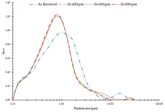 The various ball-milling (BM) trials resulted in similar results, as the window explored in terms of milling time was chosen according to the existing literature and was quite restricted, as, in this process chain, the ball milling is a preprocessing step that aims to break the agglomerates in the as-received powder rather than significantly changing the powder-size distribution. In addition, longer ball-milling times would increase the slurry preparation time and, therefore, increase the total time duration of the process chain, the completion of which, in the case of additive manufacturing processes, is already relatively time-expensive. Hence, a tight range for ball-milling time was chosen while the ball-milling speed was allowed to change in a wider range, as reported previously in Table 1. Nevertheless, some of the trials, slightly more than other trials, managed to shift the distribution toward a lower average particle size, while breaking the agglomerates in the micron scale and leaving behind mostly sub-micron particles. For brevity, only the most successful trials are reported in Figure 3.