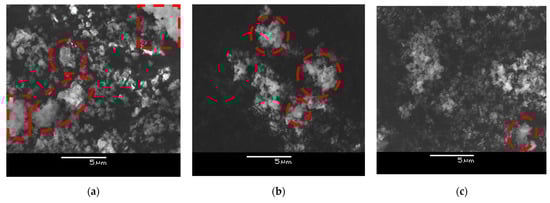SEM images of BM powders: (a) 1 h 400 rpm; (b) 1 h 600 rpm; (c) 1 h 800 rpm. Visible agglomerates are circled in dashed lines.