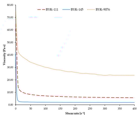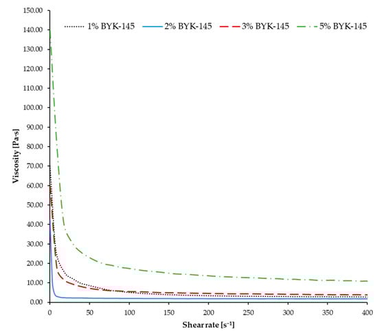 Viscosity vs. shear rate of slurries with BYK-145 at different weight contents.