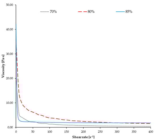 Afterwards, the role of the solid loading was examined; the rheology of the various slurries is reported in Figure 7. As expected, the 70 wt.% solid-loaded slurry exhibited a less viscous behaviour, which resulted in a more liquid slurry being unable to remain within the reservoir during the DLP printing and moved via the tape-casting foil system of Admaflex130 without spilling out. This was due to the extremely low viscosity (<1 Pa·s in the window of interest). On the contrary, the 80 wt.% loading resulted in a more viscous slurry than the 85 wt.% loaded slurry at lower shear rates, and slightly less viscous at higher shear rates. It is possible that the quantity of the dispersant was not optimal for the former, so the particles were flocculating at lower shear rates; however, as higher percentages of solid loading facilitate the densification of the finished samples while reducing the shrinkage and, hence, the insurgence of cracks due to the geometrical modifications, the 85 wt.% was preferred as it also showed better properties without further studies. The 90 wt.% solid-loaded slurry was also prepared, even though it was expected that increasing the packing fraction would have rapidly increased the suspension viscosity []. In fact, its consistency was more similar to a powder rather than a slurry, even after long mixing and varying the percentage of dispersant. This was essentially due to the reduction of the average distance between the ceramic particles when the solid loading was increased; as a consequence, a relevant increase in the friction between them resulted in a higher viscosity []. Therefore, it was concluded that such a high solid loading was not viable and the 85 wt.% solid-loaded slurry was selected for the continuation of the study.