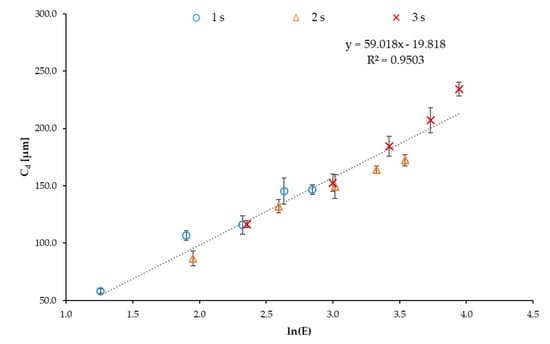 The values of Dp and Ec can be deducted from the linear regression of the collected data and, in particular, Dp = 59.018 µm and Ec = 1.399 mJ/cm2. While the latter is compatible with a highly reactive slurry, the former describes a slurry that permits better control of lateral definition, as smaller values of Dp promote higher resolution []. In addition, even though all the values were registered while using different exposure parameters, all the collected data points lay acceptably around the trend line obtained from the linear regression with a good correlation coefficient, demonstrating that Dp and Ec are independent of the exposure conditions [].