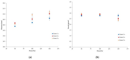 Diameter dimension (a) and measured density (b) of the DLPed discs with 25 µm layer thickness.