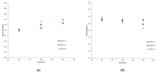 Side dimension (a) and measured density (b) of the DLPed plates with 25 µm layer thickness.