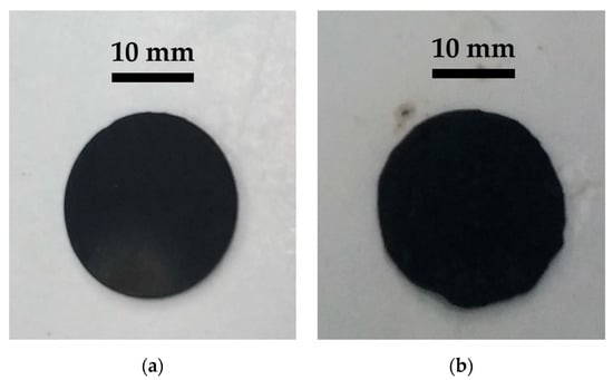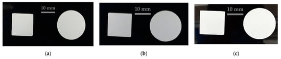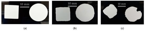 Afterwards, the printing trials were started following the schedule established through the DOE. Among all the trials undertaken, the 25 µm layer thickness samples were the most successful in terms of the density achieved and the fidelity of the dimensions to the starting CAD design (CAD diameter = 20 mm; CAD plate side = 15 mm) and, in particular, the ones corresponding to the lowest level of exposure power were the most outstanding, as can be seen in Figure 9 for discs and Figure 10 for plates.
