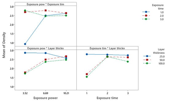 Table 5 reports the significance values for the parameters investigated and their interactions, as obtained from Minitab 21, when density is imposed as the response to analyse, while Figure 13 and Figure 14 illustrate the factorial plots for the density.