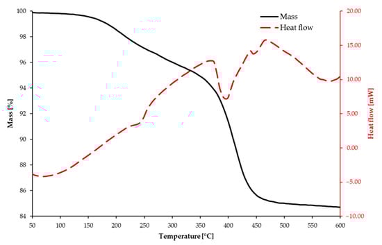 The TGA–DSC study of the green body provided data on the breakdown behaviour of the organic materials in relation to the fluctuating temperature (Figure 15). At around 375 °C and 480 °C, two significant exothermic peaks were recorded and, as seen by the TG curve, the total mass loss was 15.29%, indicating the complete burnout of the organic components. The first mass loss began to occur when the temperature was between 150 °C and 250 °C. This weight loss can be ascribed to the evaporation of adsorbed water and residual cleaning solution. The second mass loss took place between 270 °C and 380 °C, while the third and last significant loss occurred between 390 °C and 550 °C, beyond which the mass loss was negligible. Since the starting ceramic powder was α-Al2O3, from the DSC curve it can be deduced that the thermal debinding reaction was an exothermic process with two major peaks, the former attributed to the oxidative decomposition of polymer chains and the latter ascribed to the thermal decomposition of the crosslinked polymer network []. The debinding regime was established, based on these findings. Figure 16 illustrates the temperature settings for the debinding procedure in detail. The temperature was increased from room temperature to 175 degrees Celsius and allowed to dwell at this initial temperature setpoint. The temperature was then raised to 375 degrees Celsius and sustained for another dwelling-time period in order to degrade the organics slowly and, as a result, alleviate the thermal strains on the ceramic components. Afterwards, the system was heated to 480 degrees Celsius and kept at this temperature. Finally, the temperature was steadily increased to 1000 degrees Celsius to eradicate any organic residue and to pre-sinter the sample, which was held for another dwelling and, then, left to cool down to room temperature. Throughout the whole debinding procedure, the rate of heating was regulated according to the ongoing scheduled trial. Figure 16 illustrates the debinding regimes investigated.